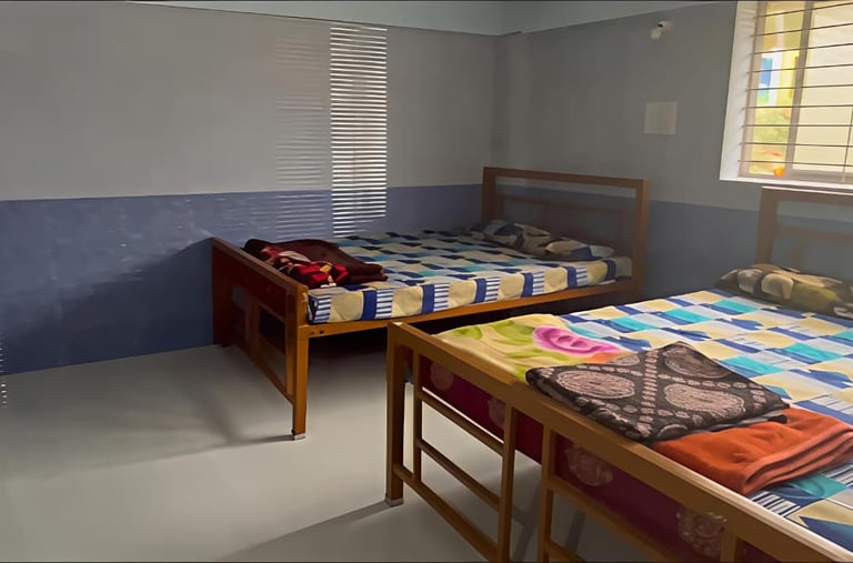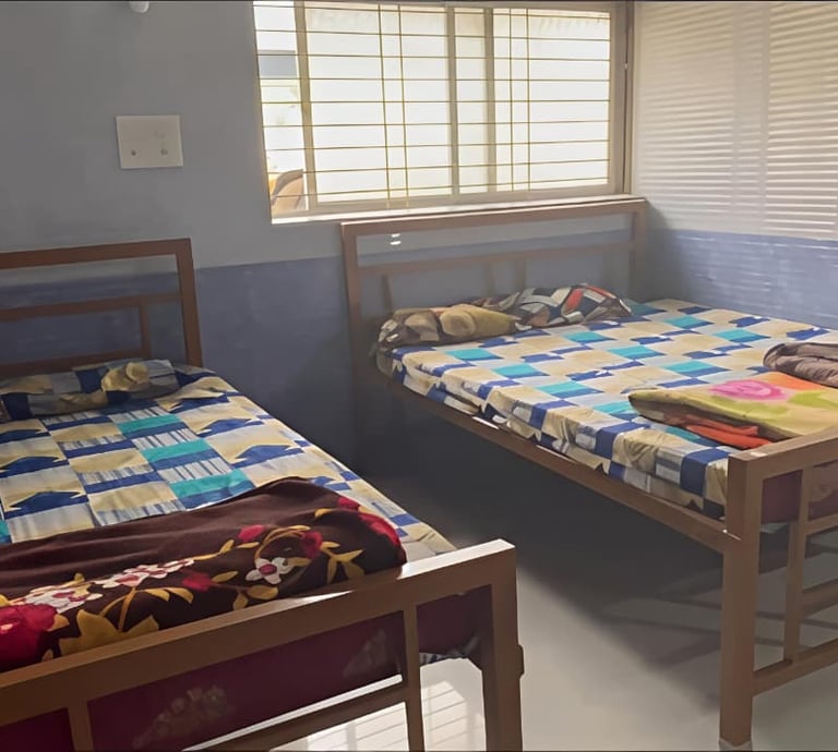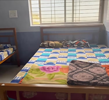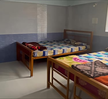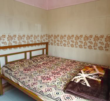 Our double cot rooms are spacious and well-appointed, featuring two separate king-sized cots designed to provide ample comfort and privacy. Each room comes with an attached private washroom equipped with a modern western-style toilet and essential amenities. Ideal for large families, groups, or travellers sharing accommodation, these rooms can comfortably accommodate 6–8 adults, ensuring a pleasant and relaxing stay for all guests.